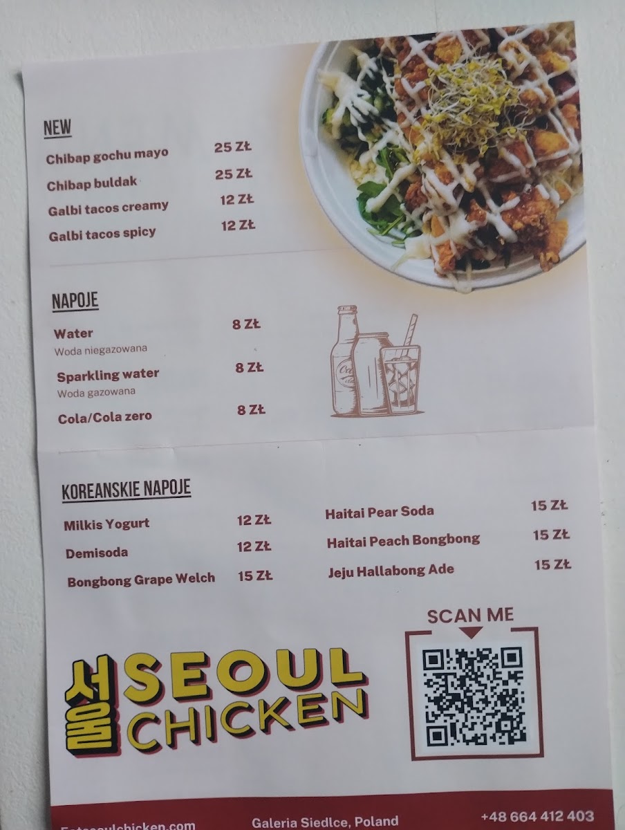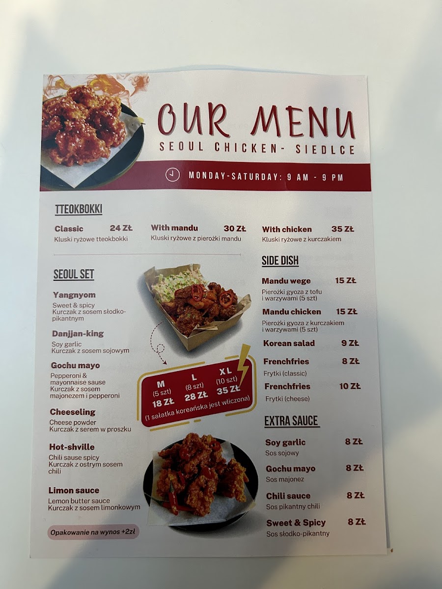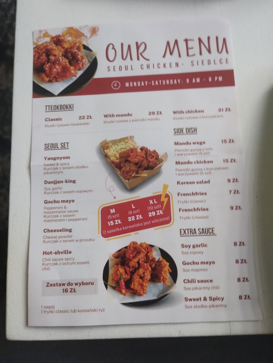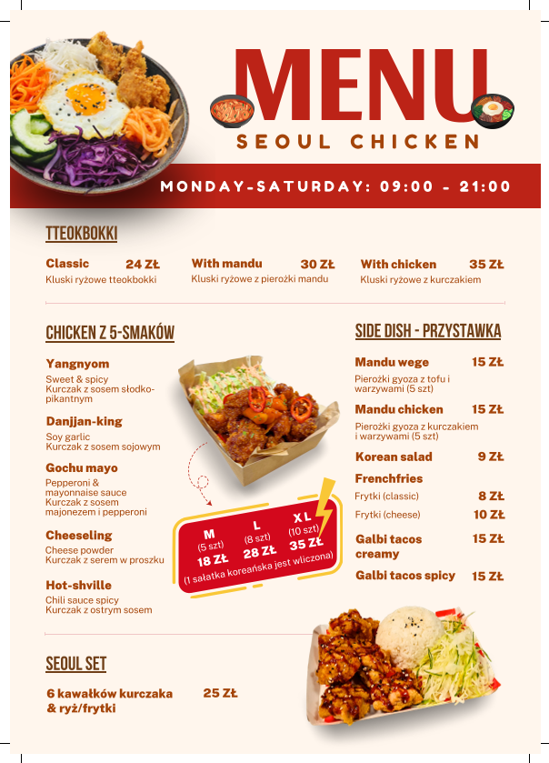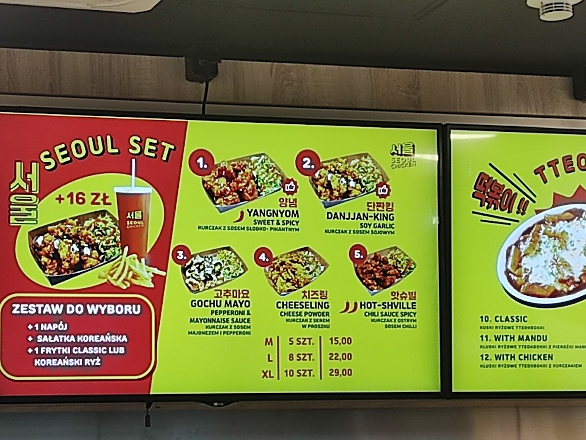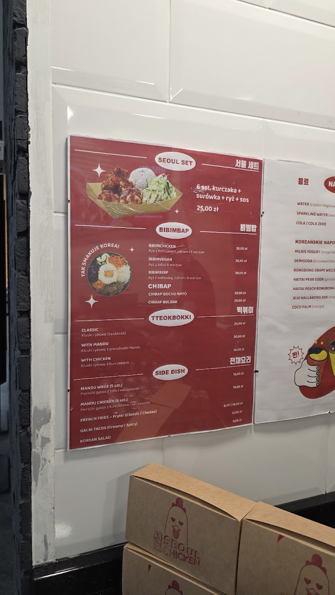 The menu at Seoul Chicken in Siedlce offers a variety of flavorful dishes, bringing a taste of Korean cuisine to the local scene. The Chibap Gochu Mayo and Chibap Buldak provide a savory base, with the unique touch of Seoul Cheeseling Cheese Powder adding a creamy twist. For those who love a spicy kick, Tteokbokki Classic, BibimBeef, and BibimChicken offer satisfying options. As a great appetizer, the Mandu Wege (5szt) is a perfect starter. The restaurant also features combo meals like the SeoulChicken Set 1 and the Zestaw Seoul Yangnyom Sweet & Spicy, ensuring guests can enjoy a full Korean experience with a balance of flavors. Whether you're in the mood for something classic or daringly spicy, Seoul Chicken caters to every taste.